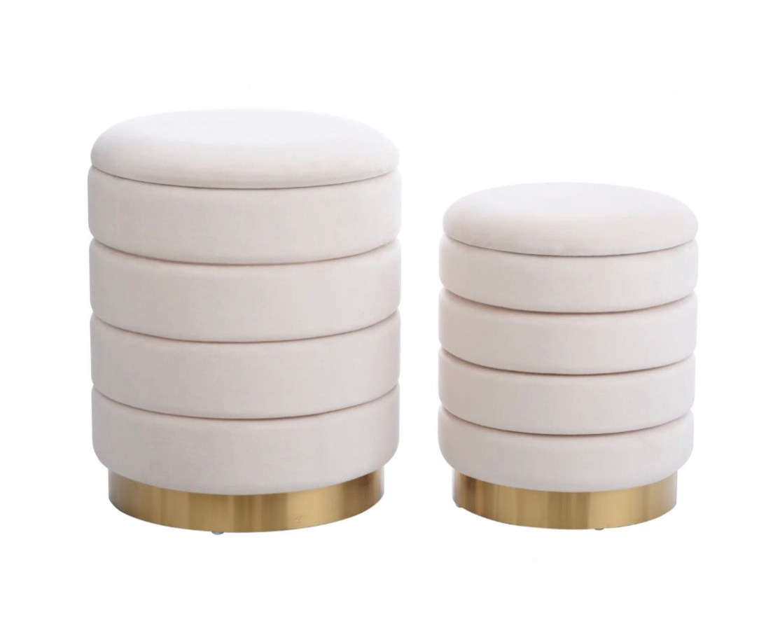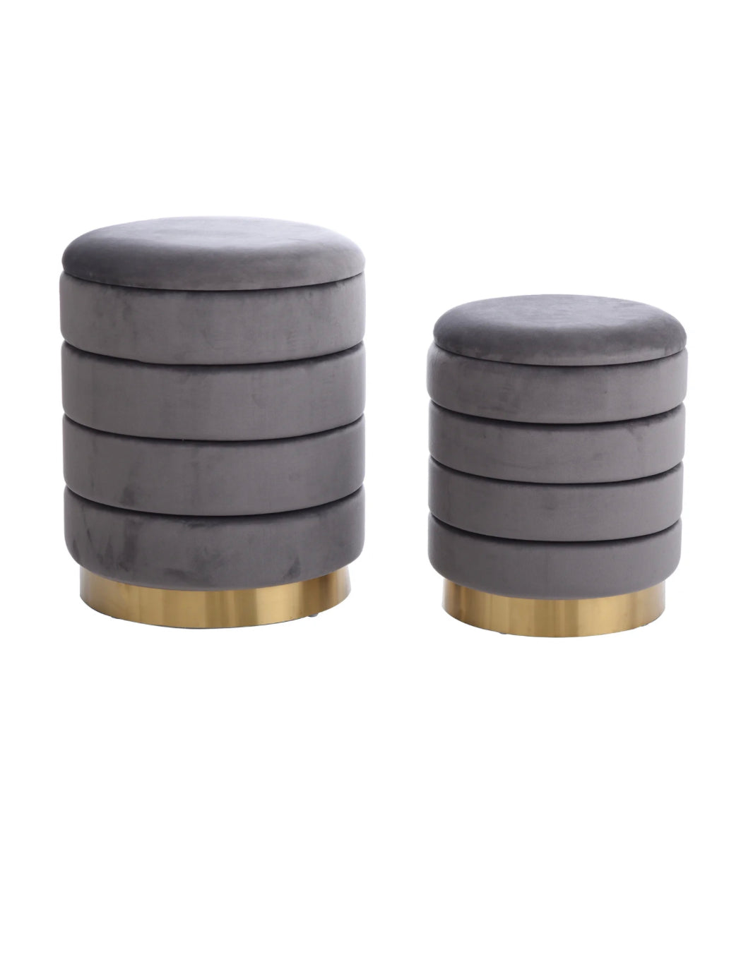 Both ottomans are composed of velvet fabric with a gold finished metal band that decorates the base of each ottoman. Set of 2 ottomans have a multifunctional design, where they can be used for storing items inside them. The tops of each ottoman lift off to expose the storage cavity held inside.