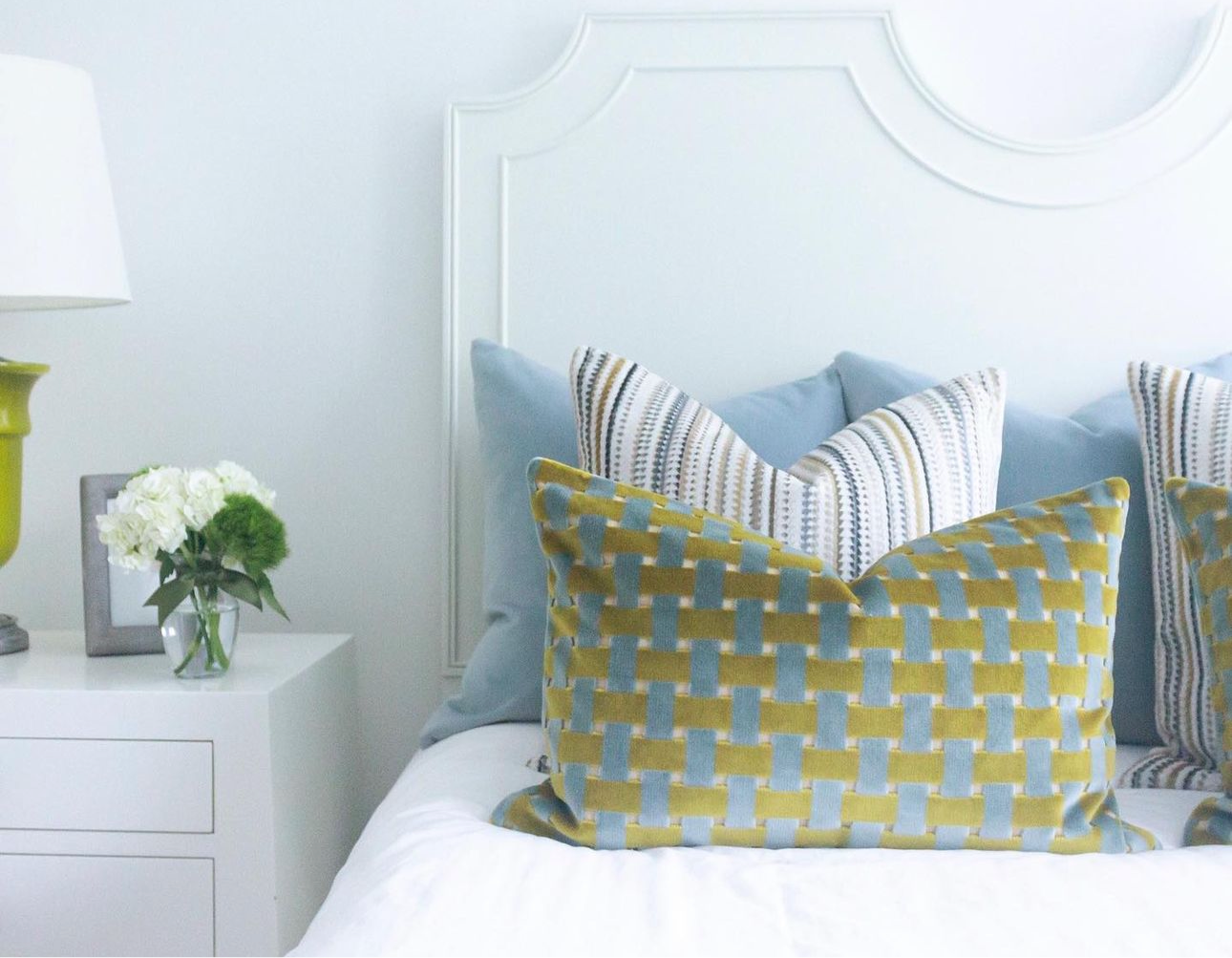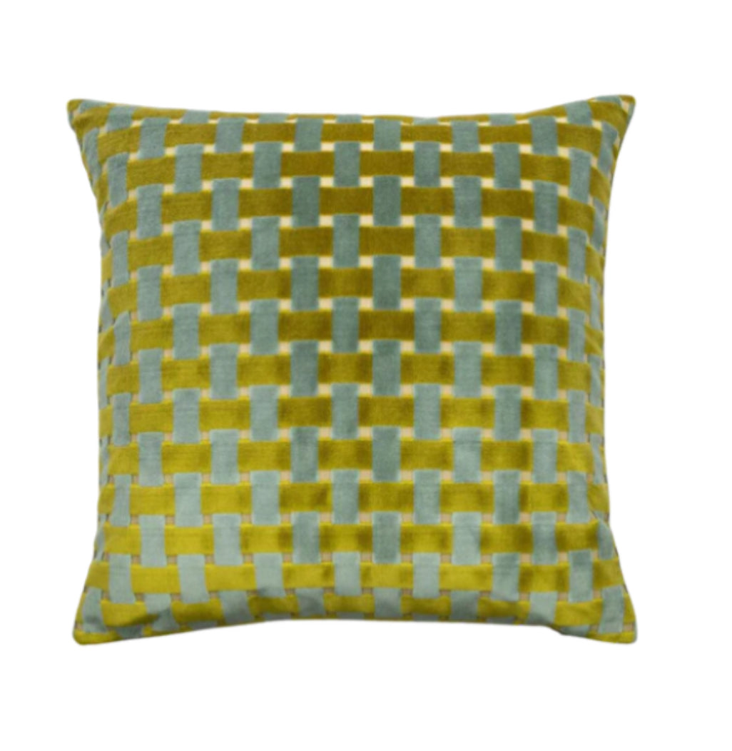 Chartreuse green and blue cut velvet pillow in a standard basket weave pattern.