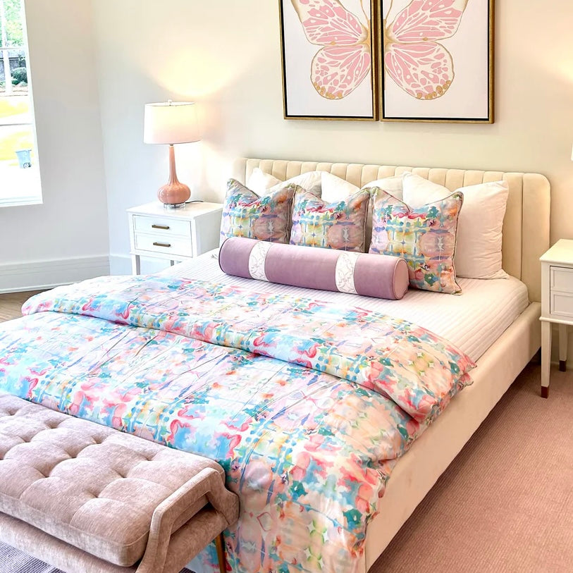 The "Spring Fever" pillow/bedding collection is based from MK's original abstract painting! The colors are absolutely gorgeous! They are joyful, happy, and tie together perfectly with a variety of color palettes and create a beautiful and unique look!