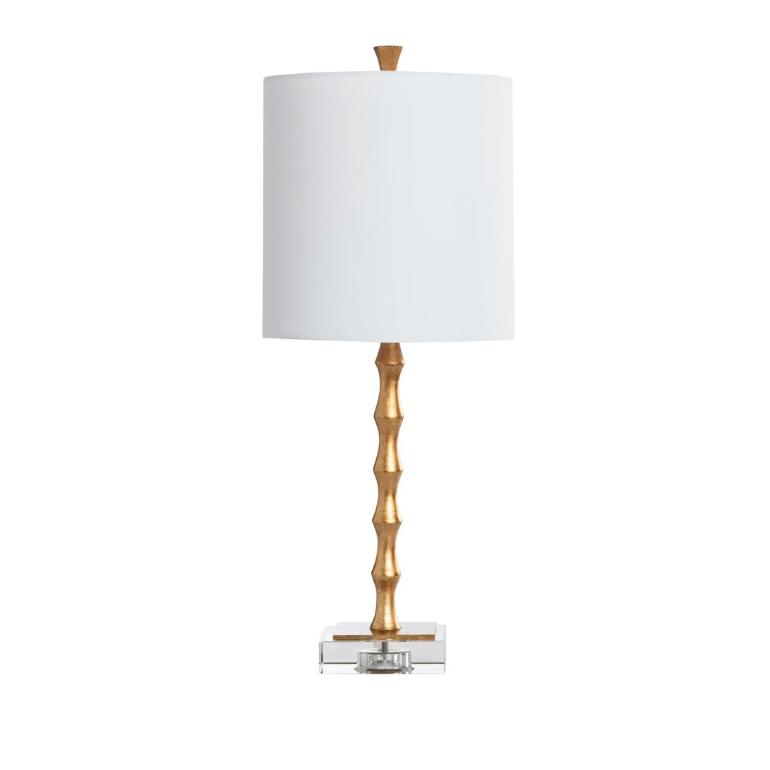 Gilded Metal, Crystal Base Lamp is simply elegant as the gold pole of the base ebbs and flows to the round, white lamp shade. The rectangular base is clear crystal and has a plate of gold-toned metal between the crystal and the pole.